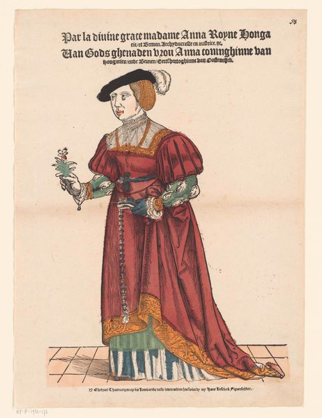 Pieter Coecke van Aelst made this print, "Portrait of Eleonora of France," using woodcut and color in the mid-16th century. The formal setting of the portrait, combined with heraldic symbols, points to the importance of noble lineage and the construction of dynastic power in the 16th century. This colored print demonstrates how the Netherlandish workshops used reproductive technologies to amplify the prestige and power of the European aristocracy, using visual codes related to nobility and empire. The print was produced in Antwerp, a center of artistic and commercial exchange. The inscriptions in Latin and Dutch reflect the complex cultural landscape of the Netherlands under the Habsburgs. Artists like Coecke van Aelst found themselves negotiating between local traditions, the demands of the court, and the expanding market for art. Historians of art and culture can use sources, such as guild records and family papers, to understand the social and institutional conditions under which such works were produced and consumed. The study of prints such as this gives us insight into the history of art, as something closely tied to economics and political power.