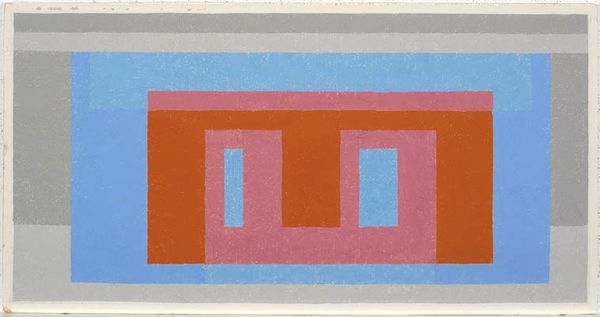 Editor: We’re looking at Josef Albers’ "Variant/Adobe," created in 1948. It's a print composed of nested, colorful rectangles, primarily in shades of pink, red and brown. At first glance, the geometric composition seems rather simple, yet there is an intriguing spatial ambiguity created by the overlaps. What’s your read on this work? Curator: You know, that initial sense of simplicity? Forget it! Albers wasn't just stacking shapes. He was a magician playing with perception. Imagine him, almost obsessively exploring how colors interact, push and pull, advance and recede. Look at how the central red rectangle hums against that earthy brown – does it feel like it's popping out at you or sinking into the background? Editor: I see what you mean. The red does vibrate a little. Is it supposed to be… unsettling? Curator: Not unsettling, perhaps… stimulating! He's prodding us to *feel* the colors. To sense their temperature. And the "Adobe" reference in the title suggests landscape. It's almost like he's bottled a sunset, right? Albers asks a deeper question about whether what we see *is* what is there at all? Editor: That’s really interesting, almost a challenge to our own senses. So he’s not just arranging colors; he’s kind of… challenging us. Curator: Precisely! He nudges us to understand colour relationships beyond just the hue itself, it's about the feeling they evoke. Editor: This makes me appreciate the work so much more than I did at first glance. It's deeper than just coloured rectangles, it’s a study of how we see. Curator: Exactly. Art, in its best form, is inquiry and experimentation that reflects on perception. That's why Albers is still teaching us, even now.
