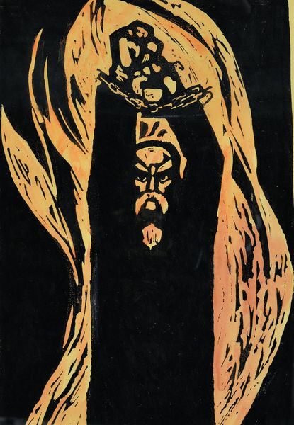 Paul Gauguin created this woodcut print, "Memory of Meijer de Haan," using stark contrasts of black ink on a light ground. The composition is dominated by three figures rendered with bold, simplified lines that evoke a sense of primal expressiveness. The foreground figure's mask-like face startles us with its exaggerated features and intense gaze, which might suggest the artist’s exploration of psychological depth through distortion. Behind, two more figures add to the enigmatic narrative. Gauguin departs from traditional representation, embracing a flattened perspective. The rough texture and visible wood grain emphasize the materiality of the print, reminding us of the artist’s process. Gauguin's woodcut employs signs and visual codes to destabilize conventional portraiture, challenging viewers to engage with the emotional and symbolic content. The print stands as a testament to the artist’s innovative approach, using formal elements to convey complex ideas about memory and representation.