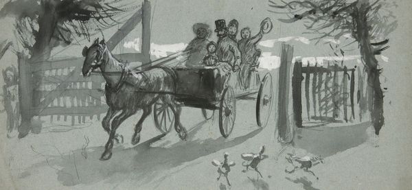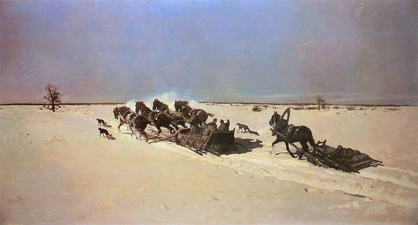 Editor: Józef Chełmoński’s "Four in Snowdrifts," painted in 1873, captures a horse-drawn sleigh racing through a snow-covered landscape. There's an intense, almost frantic energy, driven by the motion of the horses. What captures your attention when you look at this work? Curator: It’s the palpable sense of speed and wildness, isn't it? I imagine myself right there, bracing against the biting wind. Chełmoński really nailed the raw, untamed spirit of the Polish winter landscape. And have you noticed how the blurred lines and impasto technique emphasize the feeling of movement? It's like he’s bottled pure kinetic energy. Do you get a sense of romanticism intertwined with realism in it? Editor: I see it, absolutely. The way the horses seem to burst forth from the canvas, almost overwhelming the human figures. And that slightly hazy background lends itself to romanticism. Is there a story implied, or is it simply about capturing a moment? Curator: Ah, the beauty of a genre painting lies in the suggestion. To me, the implied narrative dances between the everyday and the epic. Maybe they're rushing towards a warm hearth, or maybe escaping something… perhaps the harsh realities of 19th-century Poland? The open-endedness makes it even more compelling, wouldn’t you agree? Editor: That’s a great point. I hadn’t considered the broader context. It transforms the painting from just a scene to something much richer. Curator: Exactly. And those dark, almost abstract shapes that represent the horses against the stark white snow, somehow capture both their brute power and vulnerability. I like how my interpretation shifted today through this little talk we had. Editor: I completely agree. I’ll definitely be looking at this one differently now, focusing more on the emotions it evokes. Thanks for illuminating its context and mood so brilliantly!