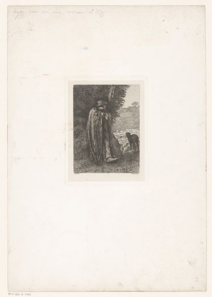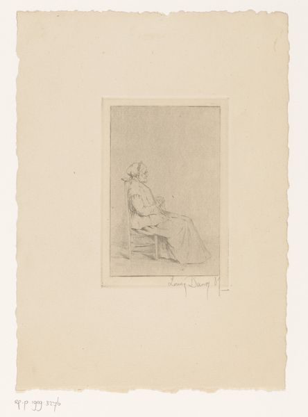 Curator: Here we have "Old Woman with Rosary between Folded Hands," a drawing by Louise Danse, created in 1887. It resides here at the Rijksmuseum. Editor: It’s quite affecting. Something about the tentative, almost ethereal lines suggests fragility, both of the paper and the subject herself. The emptiness surrounding the figure enhances this sense. Curator: Indeed. Notice how Danse uses the rosary beads. While appearing to be a simple devotional object, the beads are also a potent symbol of prayer, remembrance, and even suffering within a religious context. Its presence deepens the portrait's emotional impact. Editor: I’m struck by the medium. The directness of pencil on paper, how readily available and inexpensive those materials were—emphasizes the realities of the woman’s existence, likely modest, quite possibly difficult. There is something beautiful about such humble materials being used for a potent subject. Curator: I agree. It brings forth a discussion on the material means of representation, and how a "humble" depiction doesn’t automatically imply simplicity or superficiality. I believe we are invited into her personal domain and quiet introspection. Editor: The etching process contributes, too, by offering repeatability but retaining marks of production by a female artist; that she chose such a familiar, commonplace subject adds dimension to Danse’s project overall. Is she seeking universality? The woman becomes, in effect, Everywoman. Curator: Perhaps that’s precisely it. Danse is using a very specific image and likeness to represent a broader, timeless human experience – reflection and solitude in the later stages of life. She’s creating a kind of universal language through the visible depiction of form and posture. Editor: I am left pondering how something rendered with such modest materials yields such a resonating impression, provoking dialogues around labor and memory, faith and the common experience across social lines. Curator: For me, Danse’s work proves how symbolic and emotional potency reside within everyday subjects, urging one to value understated human stories that resonate with broader significance.