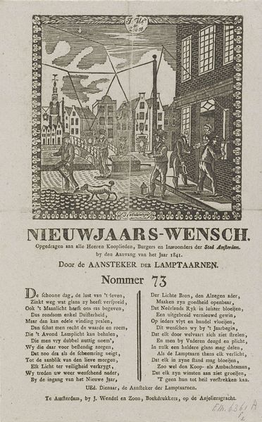 Dirk Wijbrand Tollenaar made this print, titled "New Year's Wish of the Amsterdam Night Watch for the Year 1836," to celebrate the new year. It was made with etching. This was a period of social and political upheaval in Europe. This print serves as a fascinating window into the social fabric of the time, reflecting the Amsterdam Night Watch's role, and its relationship to the city’s merchants, citizens and residents. The image creates meaning through visual codes, cultural references, and historical associations. The Night Watch was a civic guard, responsible for maintaining order and security in the city. The text alludes to Dutch identity, the role of the monarchy, and the importance of civic duty, reflecting the complex social and political landscape of the Netherlands at the time. Understanding this artwork requires considering the institutional history of the Amsterdam Night Watch, as well as the social and economic conditions that shaped its role in the city. We can delve deeper into the history of the Night Watch, explore the political climate of the time, and examine the artist's own background and influences.