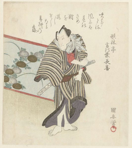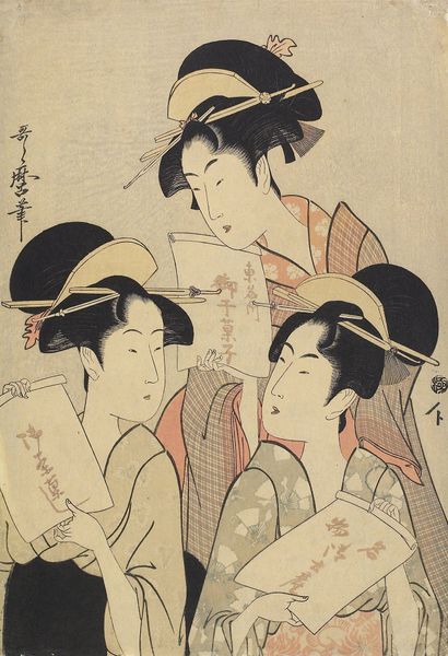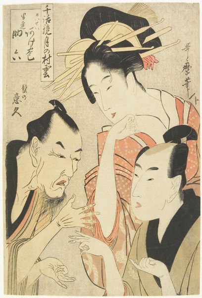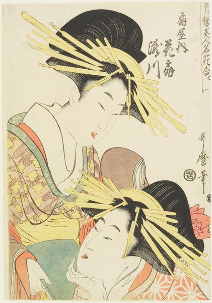Rekisentei Eiri created this woodblock print, titled "De geliefden Akeneya Hanshichi en Minoya Sankatsu", around the early 19th century. Immediately, the composition is striking, as the figures are closely arranged. The formal elements of line and color are used to create a sense of intimacy. The soft, muted tones of the robes contrast with the bold red and white floral pattern, drawing our eye to the figures' close physical proximity. This speaks to the narrative of lovers, which destabilizes social norms and values as they seem to be in some form of embrace. Notice the formal play with perspective and depth. The flattening of space emphasizes the surface quality of the print, drawing attention to the constructed nature of the image and inviting us to consider how it challenges fixed meanings. Ultimately, Eiri’s manipulation of form invites ongoing interpretation. The artwork becomes a site where aesthetic appreciation intersects with cultural critique.