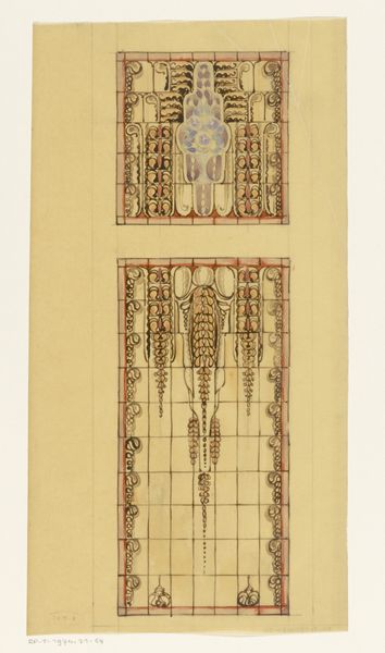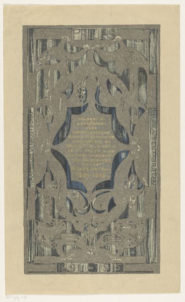 Curator: Stepping closer, one immediately notices the intricate detailing – quite evocative. Is this piece designed to evoke nostalgia? Editor: This is the "Kalender Mouton & Co. 1899" by Carel Adolph Lion Cachet, currently residing here at the Rijksmuseum. Created in 1899 using watercolor, print, and other graphic arts, it is very representative of Art Nouveau sensibilities. Curator: It’s beautiful, there's no denying that. It also feels deeply tied to a specific time and place; there is no escaping the echoes of turn-of-the-century anxieties and aspirations. The decorative framing, the repetition of vines—it feels very symbolic, ritualistic even, and indicative of cycles, rebirth. The palette is muted, the patterns ordered; it speaks of control over the natural world in a rapidly changing society. Editor: Indeed. The symbol-laden Art Nouveau was very aware of themes. Note the strategic use of grapevines, leaves, and perhaps the rising sun: they echo motifs linked to prosperity, fertility, and, importantly for this particular firm, I think, pleasure. Curator: "Mouton & Co."—are they vintners then? What's interesting is how these recurring vegetal symbols mask social changes of the time. The late 19th century was a turbulent period, deeply fractured along class lines—yet these idealized, Arcadian symbols are meant to represent something altogether different. Editor: Exactly! So while this piece seems merely decorative, it acts almost like a manifesto or an invocation. Curator: And consider the role this calendar was meant to play in a home. This calendar marked not just the passage of time, but also the owner’s ambitions. Editor: Precisely! When you hang a calendar on a wall, what else are you hanging, right? Aspirational, that's the key word to take away today! Curator: A window into aspirations cloaked in ornament – it offers us far more than just pretty visual designs.