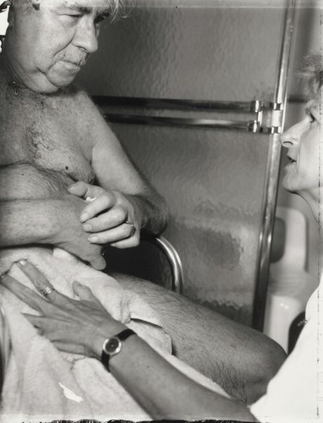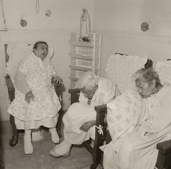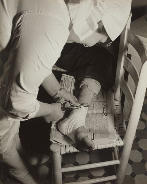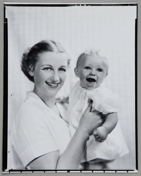 Editor: This photograph, "Europe's Children," was taken by David Seymour in 1948, and it looks like a gelatin silver print. There's a woman, maybe a mother, holding a baby over a tub. It's such a simple scene, but something about the starkness of the black and white gives it a feeling of profound melancholy. What do you see in this piece? Curator: The melancholic atmosphere you perceive resonates deeply, particularly considering the post-war context. Seymour, a co-founder of Magnum Photos, dedicated himself to documenting the human condition, especially the impact of conflict. The baby being cleansed, undergoing a ritual of sorts, poised between being supported by the caregiver and then lowered into the waters of an uncertain future, brings to mind the biblical imagery of baptism and redemption. Editor: That's interesting - I didn't make the connection with baptism initially, but I can see that. It almost feels like a symbolic cleansing after the war. Do you think Seymour intentionally alluded to religious iconography? Curator: Perhaps not directly, but these archetypal images often operate subconsciously. Water holds a potent symbolic weight, representing purification, rebirth, but also potential danger, particularly pertinent to those displaced by the war, embarking on new, precarious beginnings. Consider also the visual weight placed on the mother figure; her subtle smile betrays resilience, mirroring countless women who rebuilt shattered lives and fostered hope for a continent ravaged by war. What feelings about European mothers do you see represented in this image? Editor: The resilience you mention—I can really see that in her face now. She seems both protective and optimistic despite the context. Curator: And that, perhaps, is the photograph's lasting power – it captures the universal human capacity for hope amidst profound adversity, encoded in simple gestures and shared visual memories. Editor: I've certainly gained a new appreciation for the power of photographs like this to tell these complicated stories. Thanks for your perspective!