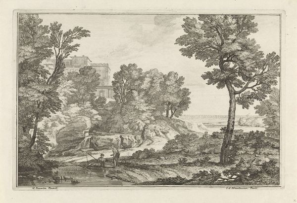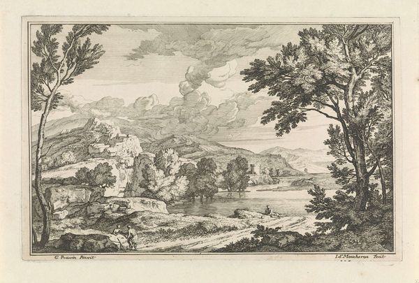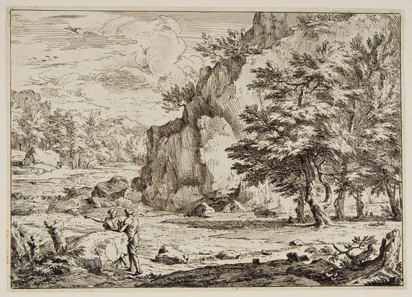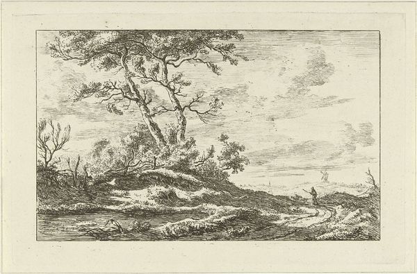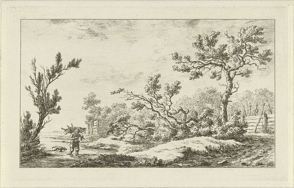Carel Lodewijk Hansen created "Hunters with a Dog on a Path," an etching, sometime before his death in 1840. Immediately, the contrast between the delicate etching and the rough, outdoor scene strikes the viewer. Hansen masterfully uses line and composition to guide our eyes through the scene. Look at the large tree on the right. Notice how its textured foliage and gnarled branches fill the frame, creating a sense of depth and enclosure. The path leads us from the foreground, where the hunters and their dog are closely observed, into the expansive landscape. The artist disrupts the linear perspective, creating a dynamic interplay between near and far. Hansen subtly engages with the semiotics of landscape, using recognizable elements like trees, paths, and figures to build a narrative that goes beyond simple representation. Instead, the scene offers a meditation on the relationship between humanity and nature. The etching, while seemingly representational, invites us to reflect on the constructed nature of landscape and its role in shaping our understanding of the world.