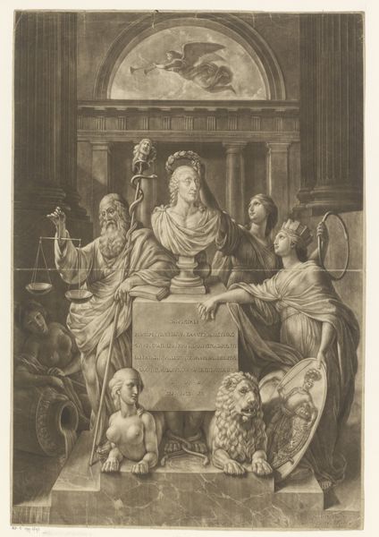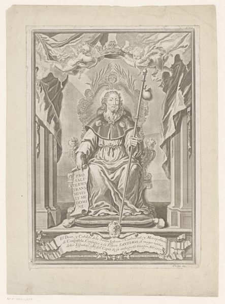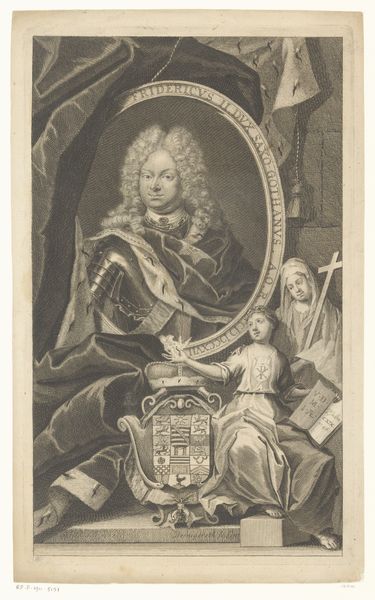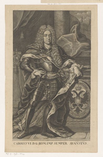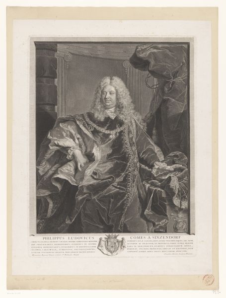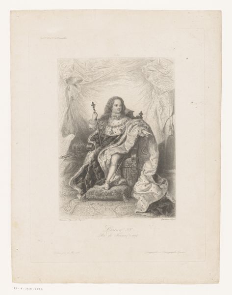 Curator: Here we have Pierre Drevet's "Portret van Lodewijk XV van Frankrijk," made in 1723. It’s an engraving currently housed here at the Rijksmuseum. What strikes you about it? Editor: The overall effect is rather melancholic, isn't it? The dark, heavy drapery looming over the pale figure of the young king… It feels almost oppressive. Curator: The portrait showcases the young Louis XV shortly after he officially began his reign. Consider the pressures on a young monarch during the twilight of the Baroque era, a period characterized by grand displays of power and wealth amidst growing social unrest. Editor: And look at the performative elements: the crown perched precariously, the scepter he holds with what looks like a rather limp wrist, and the ermine robe sliding off his shoulder. Is he really embodying the role of a divinely ordained ruler, or is it all just a costume he's not quite comfortable in? What does it say about hereditary power when someone is thrust onto the world stage because of an accident of birth? Curator: Drevet was known for his skill in capturing minute details and textures. Notice how he renders the velvet and fur with such precision. It reflects the prevailing artistic trends of the time, a kind of hyper-realism meant to glorify power. And don't overlook the implications of creating and circulating printed portraits like this. Engravings democratized the image of the king, distributing his likeness to a broader audience. Editor: Democratized, perhaps, but certainly still controlled. It's a performance of power designed to reinforce a specific hierarchy. The artist's skill becomes another tool in the arsenal of those maintaining the status quo, perpetuating myths of royal authority even as societal fault lines are widening. Curator: So, for me, the print highlights the intricate ways in which art, power, and social identity were interwoven in 18th-century France. Editor: And for me, it prompts consideration of the historical, societal impacts of portraiture, questioning its ability to authentically capture an individual rather than reinforcing established power narratives.