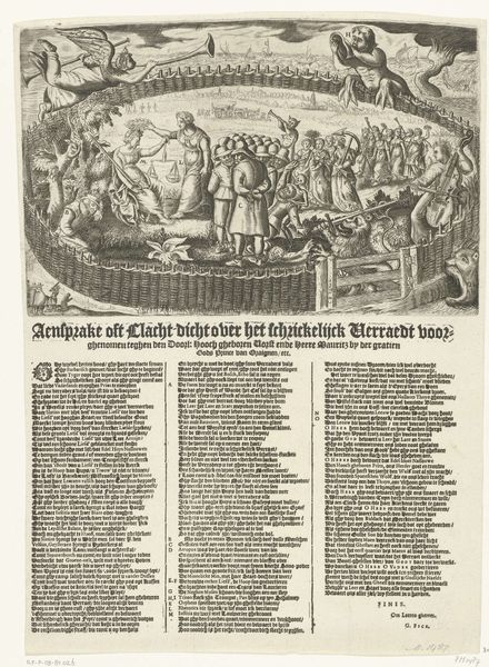 Editor: Okay, next up we have "Allegorie met Frederik Hendrik tegenover kardinaal Ferdinand," or "Allegory with Frederick Henry facing Cardinal Ferdinand," a 1636 engraving. The artist is Willem van Lande. I'm immediately struck by this almost theatrical standoff and the really intricate details, given that it’s a print. What’s your interpretation of this piece? Curator: You know, when I look at this, I can’t help but think of it as visual propaganda, pure and simple. It’s dramatic, it’s over-the-top, it's packed full of symbolism that would have been easily understood by its 17th-century audience. The artist is essentially painting a picture of the Dutch Republic as this righteous, almost divinely protected entity standing strong against Spanish aggression, embodied by Cardinal Ferdinand. Do you get that vibe? Editor: Absolutely. The two sides facing off across a wall—it does seem to be sending a clear message about Dutch resilience. So, the lion fighting… that is allegorical for something? Curator: Precisely! The Dutch Lion protecting itself. What always grabs me is how prints like these weren’t just art for art's sake, they were vital tools in shaping public opinion during a time of war and political upheaval. Each detail – from the figures trampled underfoot to the radiant light shining upon Frederik Hendrik – reinforces the Dutch cause. It’s… well, it's like a seventeenth-century political cartoon. Editor: So, understanding this as a persuasive artwork adds a whole other layer to what I initially perceived as just an intense historical scene. Thank you. Curator: My pleasure. Now go forth, young editor, and spread this understanding far and wide!