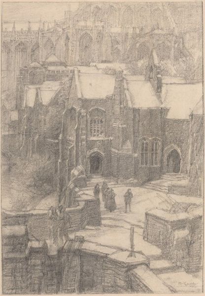 Curator: Welcome. Today we are looking at Wijnand Otto Jan Nieuwenkamp's "Oosterpoort te Hoorn," a pre-1897 ink drawing on paper. Editor: My first impression is of intricate detail. There's a meticulous rendering of the brickwork. A sort of architectural fantasy emerges from the precise linework. Curator: Nieuwenkamp was deeply engaged with the Dutch landscape, particularly its relationship to maritime trade and power. Consider Hoorn's history as a key port for the Dutch East India Company. This gate represents both access and control, reflecting the city’s wealth derived from colonial endeavors. Editor: Yes, I see the control you mentioned in the carefully composed layers, where the details are intensified around the focal points of the architecture: arched doorways and the structure’s decorated peak. It reminds me a bit of Piranesi’s architectural prints—both convey an oppressive, imposing scale through line and form. Curator: And it's important to remember the personal connection too. Nieuwenkamp came from a family of seafarers. These cityscapes weren't just aesthetic exercises, but acts of connecting with family legacy, of understanding how geographical context shaped individual identities within the broader scope of Dutch history and class structures. Editor: Agreed. The contrast of the heavily worked building facade to the sparser representation of open space beyond definitely draws the eye. And what appears to be the faint implication of foliage serves to reinforce a perspectival recession back towards the center. It does strike me as quite brilliant, actually. Curator: Indeed, analyzing Nieuwenkamp’s work, whether looking through the lens of Dutch colonialism and personal legacy or the formalism of its layered structure and carefully designed composition, ultimately opens the way to grasping some of the complexities inherent in it. Editor: This discussion helps me consider the artist's architectural interest from both points. It does feel like a very balanced observation about Nieuwenkamp’s detailed drawing.