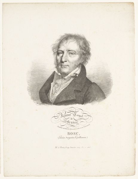 Julien-Léopold Boilly created this portrait of Jacques-Noël Sané using graphite, with meticulous detail. The most striking formal aspect of this portrait is its remarkable balance and symmetry. The composition is anchored by Sané’s centered gaze, inviting the viewer into direct engagement. Boilly uses subtle gradations of shading to model Sané’s face, giving it a lifelike quality. The texture of his coat is contrasted with the softness of his ruffled cravat. The careful arrangement of the visual elements draws attention to Sané's features. The visual organization of the portrait reflects the Enlightenment's emphasis on order and reason. Boilly’s structured approach mirrors the values of precision and clarity that defined Sané's own profession as a naval architect. The textual elements contribute to this portrait's semiotic system, reinforcing the subject's identity and status. The artwork serves as a visual document of the social and intellectual values of its time.
