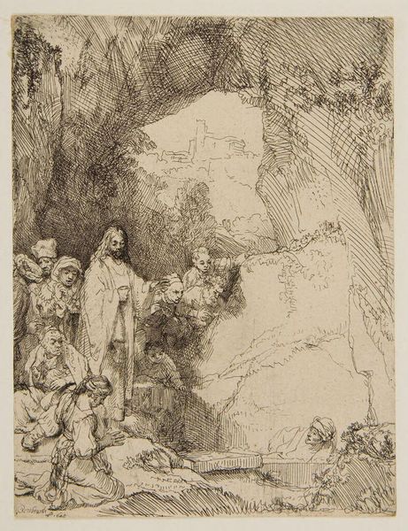 Curator: This is Rembrandt van Rijn's etching, "The Raising of Lazarus: The Smaller Plate," housed here at the Harvard Art Museums. What strikes you first about it? Editor: That figure emerging from the tomb is completely unsettling. The contrast between the darkness of the cave and the implied light is palpable. Curator: It's fascinating how Rembrandt used etching to create this sense of drama. The lines, almost frenetic in places, highlight the labor and artistry behind the print. Editor: The symbols within the work are also striking. Consider the way Lazarus is portrayed, not as a resurrected hero, but as someone almost reluctant to return. Curator: Indeed. The material process of etching allowed Rembrandt to explore the social and emotional depths of this biblical story. Editor: Ultimately, it is about the enduring power of visual imagery to convey profound human experiences. Curator: Yes, and the etching's small scale focuses the viewer’s attention on the intricate details and their symbolic weight. Editor: A powerful testament to the story.