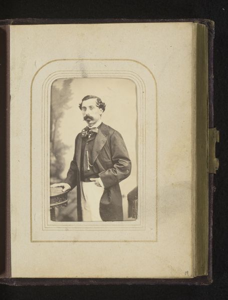 Editor: Here we have Robert Jefferson Bingham’s "Portret van de heer Poujade," an albumen print dating to around 1860-1865. It’s fascinating to see this early form of photography. What strikes me is the stiff pose and the inclusion of what looks like very ornate furniture. What can you tell us about it? Curator: It's compelling to consider the materials and processes that led to this image. Albumen prints required a meticulous coating process, each stage demanding specific expertise. Notice, too, the staging—the subject posed next to elaborate furniture. It's not merely decorative; it speaks volumes about the sitter's aspiration and economic position. What does the choice of backdrop material tell us about the availability and cost of resources during this period? Editor: That’s interesting; I hadn't thought about the resources. It gives the piece a completely different depth. Was there an established industry for portrait photography by the 1860s? Curator: Precisely. Photography democratized portraiture, to some extent. Before this, painted portraits were largely limited to the elite. How does this new accessibility affect the art market and the role of the artist? Did it shift power dynamics in portraiture and, in the broader art world, by influencing what subjects people began seeing as important? Editor: It’s a huge change to have photography available to more people. It's easy to think of it just as an image, but the entire system around it required all of this work. Thanks for expanding my view. Curator: Indeed. The finished product we see here only hints at the complex web of labor, capital, and technological innovation that made it possible. Examining the 'how' helps us understand the 'why.'