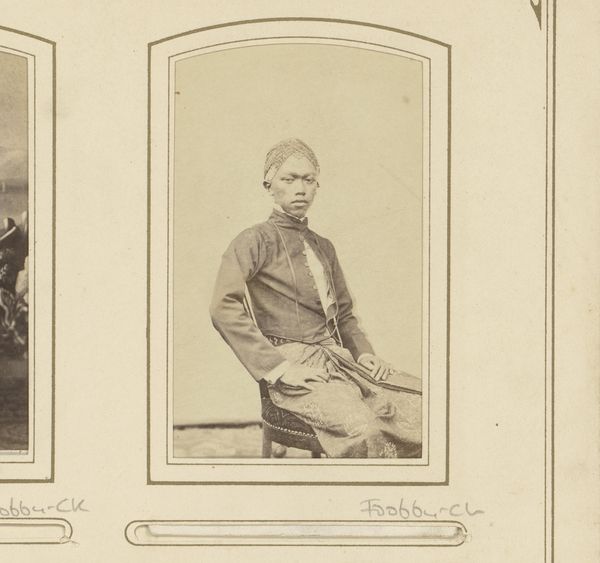 Editor: Here we have “Portret van een jonge man met hoed en fluit, zittend op een zuil,” or, “Portrait of a Young Man with Hat and Flute, Sitting on a Column,” a gelatin-silver print from between 1850 and 1900, attributed to Auguste Blanche. The young man, dressed quite formally, looks dreamily off into the distance. What stands out to you? Curator: The performative nature of this realism strikes me. He is both himself and an archetype. Note how the "column" serves more as a stage prop than a structural element. Think about the burgeoning middle class at this time and their aspirations. The portrait signifies upward mobility and perhaps even artistic leanings suggested by the flute. Does this resonate with other portraiture of the era? Editor: That's fascinating, I hadn't considered it as a performative act. Many portraits of this era appear to have serious sitters, this one with his gaze upward and slight smile seems much more whimsical and approachable. Do you think it's his class that allows him to be this way? Curator: Potentially, class plays a role, certainly. The way we use and consume images plays a pivotal role in shaping class consciousness. Consider the burgeoning photographic industry and how this makes portraits affordable for a wider range of people who aspire to a new level of societal standing. The deliberate "realism" here crafts a relatable persona. Editor: So the proliferation of photography enables this democratization of portraiture, but still plays into constructing and reflecting social class aspirations? Curator: Exactly. How the portrait operates in the public sphere—displayed, exchanged, circulated—amplifies these meanings and aspirations. What new questions about its social function does that open for you? Editor: I'm left wondering, if it’s a performative act for social mobility, how “real” can such an image truly be? Thank you. Curator: Indeed. Reflecting on the tensions between realism, performance, and societal aspirations embedded within this portrait has opened my eyes to deeper layers within such seemingly simple images.