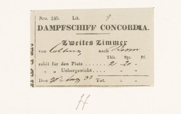 Editor: So this printed paper document, "Reisdocument," is believed to be from the 1830s. It looks like some sort of travel ticket for a steamship. It is intriguing how something so utilitarian has survived to become a piece of history on paper. How do you see it? Curator: The beauty for me lies in what this simple piece of paper reveals about the social and material conditions of travel at that time. This isn't just a ticket; it’s a product of evolving print technology and increased mobility linked to the industrial revolution. Editor: Can you tell me more about the printmaking process that created the image of the steamship? Curator: Look at the typography. Note how the fonts are used to convey a sense of officialdom and modernity – very specific to the era. Also consider the cost of the paper and the print process itself. Was this readily available to everyone? Or were such journeys only for the burgeoning middle class? What does that say about access and leisure in the 1830s? Editor: I never thought about a simple steamship ticket relating to social class so deeply! It prompts us to think about what it really meant to travel back then. Curator: Precisely. It connects consumerism and craft with the larger currents of the era. Travel created access to new raw materials, consumer demands and also colonial expansion. Consider that on your next travels. Editor: I appreciate your perspective so much. I’ll definitely look at the material aspect of things a lot more! Curator: And I think reflecting on labor will impact your artistic thinking going forward.