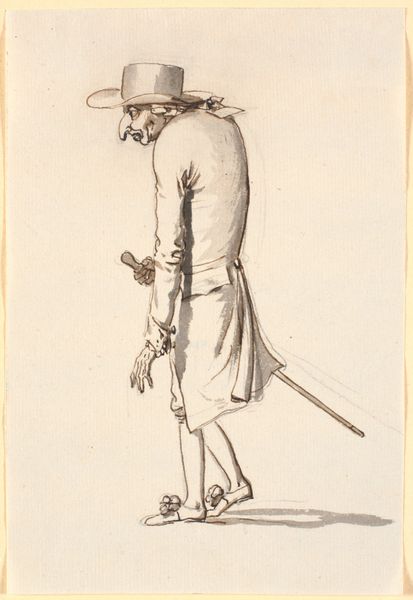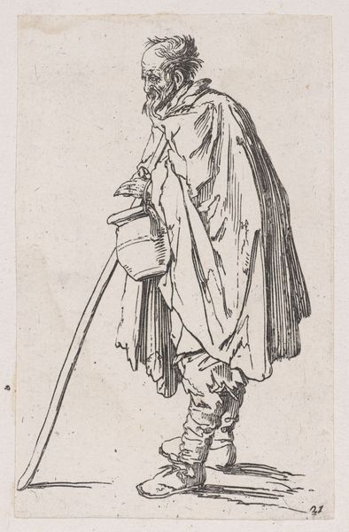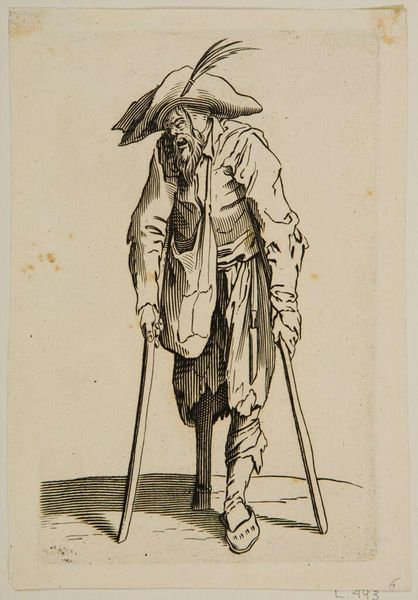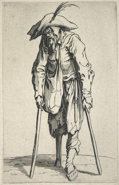 Editor: Here we have "Reverse Copy of Le Gentilhomme aux Mains Jointes (The Gentleman with his Hands Joined), from La Noblesse (The Nobility)," dating from 1625 to 1700. It's an anonymous drawing/print displayed at the Metropolitan Museum of Art. I'm immediately struck by the figure's dilapidated clothing contrasted with what seems to be an almost defiant posture. What layers am I missing here? Curator: This image, though seemingly depicting a downtrodden figure, opens a window onto the rigid social structures of the early modern period. While the attire suggests poverty, the title insists on nobility. Do you think this might be an intentional contradiction? Perhaps even a critique? Editor: That's a very good point! The title and the image don't seem to line up. Could it be making a statement about the plight of the nobility during that time, perhaps a decline in their power or relevance? Curator: Precisely! We must also consider how the printing press democratized images. This "copy," mass-produced, circulates an idea. Is it to humanize a noble reduced to these circumstances? Or, is it a biting satire? The gaze and bearing of the subject are key to answering that. Editor: I see. His eyes, though shadowed, do seem to hold a certain pride or…resignation? It’s ambiguous, but that tension speaks volumes. Curator: Exactly. The artist may also be making a statement about the changing social landscape and questioning what it truly means to be noble in a world increasingly defined by wealth and commerce rather than birthright. This piece invites us to think about visibility and invisibility, and who gets to tell whose story. Editor: Wow, I didn't see all that at first glance! Considering the social and political context really transforms the way you see the artwork. Curator: Absolutely! Art acts as a mirror and a lens, reflecting its time, while also shaping how we perceive it.