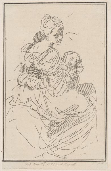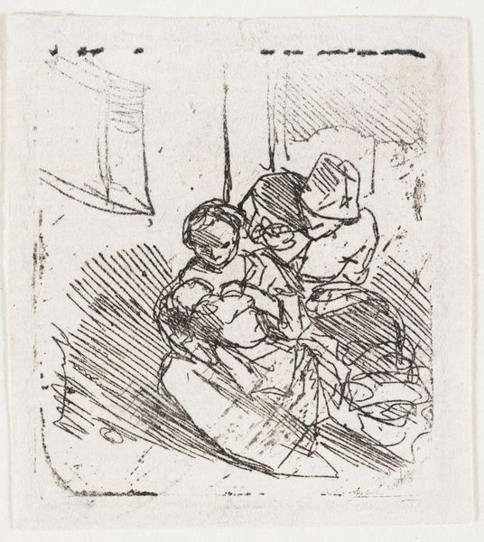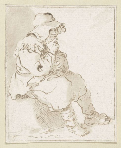 Editor: This pen drawing, "Man Sitting on a Stone" by Hermanus Fock, dating roughly between 1781 and 1822, has such an air of melancholy about it. The subject seems so withdrawn. What do you see in this piece that speaks to the context of its creation? Curator: The figure, rendered in the genre style popular then, invites reflection on the social and political landscape of the time. Consider the late 18th and early 19th centuries: a period of immense upheaval, from the Enlightenment’s challenges to established hierarchies to the rise and fall of Napoleon. How might such instability be reflected in depictions of ordinary individuals? Editor: Perhaps the man's dejected posture is a subtle commentary on the anxieties of the common person amidst all this change. But could it also be mere observation? Curator: It's tempting to see it simply as a genre study. Yet, the drawing resides in the Rijksmuseum—an institution itself shaped by 19th-century nationalism and the desire to create a shared Dutch identity. Does the act of preserving and displaying such a work imbue it with a different meaning, elevating it from simple observation to a symbol, however subtle, of a specific social class or condition? What public function does this image serve? Editor: That's a perspective I hadn’t considered. The very act of putting it in a museum gives it significance. Curator: Exactly! And it encourages us to question whose stories get told, and how institutions shape our understanding of them. Editor: So it is a simple image, perhaps, but rich in institutional context. Thanks, this has helped me think about the broader implications of art in society. Curator: And you've helped me see the direct impact these grand narratives can have on our reading of a humble drawing. A fruitful exchange!