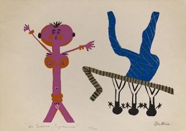 Alexander Calder, known for his innovative mobiles, created this playful ink drawing of imagined creatures on paper. The immediate impression is one of whimsical vitality, sparked by the vibrant orange and green against stark black lines and a pale background. These creatures are not defined by realism but by the abstract qualities of line and form. Calder uses line to suggest movement and emotion. Look at how the eyes, drawn as spirals, bring focus and a sense of wonder, while the strategic use of negative space adds to the composition's lightness. The creatures, with their exaggerated features, hint at a deeper engagement with surrealism, where forms are distorted to challenge our perceptions of reality. Ultimately, this work exemplifies Calder's ability to synthesize complex ideas into simple, accessible forms, inviting viewers into a world where imagination reigns supreme. The linear structure not only defines shapes but also opens up possibilities for interpretation, showcasing art's dynamic relationship with perception.