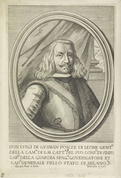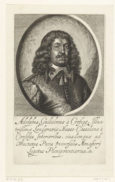 Curator: What a stern fellow! The meticulous detail of this intaglio gives "Portret van Jean Gaspar Ferdinand de Marchin, graaf van Granville" such weight. Editor: Weight is right! The materiality is so important; you can practically feel the pressure of the plate on the paper. Look at how the engraver, Cornelis Meyssens, has built form with incredibly fine lines. It really is more about the tactile experience. Curator: The Rijksmuseum dates this piece to between 1670 and 1674. Meyssens, working in the baroque style, captures the Count's station through carefully constructed public imagery. He was clearly a figure of immense power and importance. Editor: Absolutely. And it's not just the individual, but what the portrait does, that interests me. The social labor behind the original commission. Was this intended to reinforce his authority, to solidify his image? What narratives of control and skill were conveyed through it? Curator: Certainly, that was a primary function of portraiture. Remember, images like this circulated widely, establishing and reinforcing hierarchies within society. Note the inscription lists all his titles, solidifying his power. Editor: Exactly. I also wonder about its reception at the time. Looking beyond just the ruling classes: how did commoners experience and interpret such portrayals of nobility? We need to get behind the surface, analyze these layers, even the economics of the prints themselves. Curator: Agreed, exploring the piece from various societal perspectives does give you the fullest possible image. Editor: Yes, this seemingly straightforward portrait has layers that challenge and provoke ideas about power, artistry, and social impact. Curator: Very true. I'll look at the piece with fresh eyes.