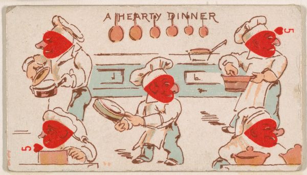 Curator: This curious card, "Six of Spades, Boil the Kettle," comes from Kinney Brothers Tobacco Company's Harlequin Cards series, dating back to 1889. It's a coloured-pencil drawing and print, a rather unusual combination for the time. Editor: It's delightful, yet perplexing. My initial reaction is a sense of domestic absurdity. Why are playing card symbols integrated in what appears to be household chores? Curator: Precisely! What's fascinating here is Kinney Brothers’ branding strategy. These cards, inserted into cigarette packs, transformed everyday smoking into an elevated experience. Think about the paper quality, the inks; even this relatively ephemeral item required deliberate material sourcing. Editor: Yes, and placing it in the context of the late 19th century, consider how tobacco use was deeply ingrained in societal structures, gender dynamics, even colonial expansion. A card like this isn't merely about selling cigarettes; it’s reinforcing those broader power structures. Curator: The imagery of working-class individuals tending to the kettle raises a valid point. It’s essentially free advertisement relying on circulating, consumable art. How much these artists made and whether they saw it as art is less discussed. Editor: The placement of spade symbols seems strategically ambiguous. Are these women participating or subjugated? And the composition's repetition also mimics the routine and expected behaviors of the service roles. Curator: The integration of labour, production, and consumption becomes quite striking upon analysis. Kinney Brothers certainly elevated their branding above purely marketing; the choice to connect commerce with something approaching an aesthetic experience, however frivolous it seems, has larger repercussions. Editor: Indeed. This little card, though seemingly inconsequential, opens up a critical discourse about the intersectionality of class, labor, and advertising in late 19th century society. Curator: I agree. Analyzing “Boil the Kettle” demonstrates the true material processes in a context shaped by consumer culture. Editor: And that even ephemeral items like this hold rich cultural and societal commentary, if we choose to look.