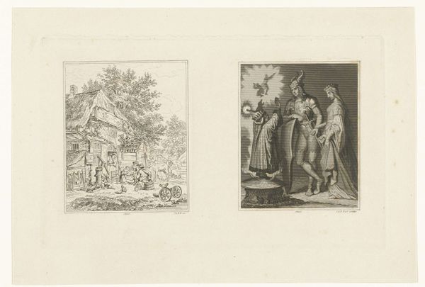 Curator: Here we have Daniel Nikolaus Chodowiecki’s "Twee voorstellingen uit de verhalen van Wilhelm Gottlieb Becker," created in 1797. It's an engraving, offering a fascinating glimpse into late 18th-century aesthetics. Editor: Oh, what a captivating little diptych! The moment I lay eyes on it, I feel like I’m peering into the dreams of an Enlightenment scholar – delicate, detailed, almost ghostly in its monochrome palette. Curator: Indeed. Note the careful rendering of space. The print employs line and stipple engraving techniques, establishing depth and volume. Chodowiecki’s structural precision is apparent in both panels, offering a comparative study of indoor and outdoor scenes. Editor: Right, it's almost a study in contrasts, isn’t it? One scene seems like a genteel domestic drama under a canopy of leaves, a gathering of refined individuals—perhaps a consultation or a heartfelt farewell? While the other pulsates with an almost urgent, romantic flight into the wild woods. One world ordered, the other impulsive and wild! Curator: Precisely! The engraving exemplifies a blend of genre and history painting—two narratives, possibly allegorical, playing against one another. I'm intrigued by how the figures adhere to a schema that allows for clarity of gesture, if not true emotion. The viewer decodes these cues for greater insight. Editor: The linear grace is so perfectly poised. Still, it has a curious distancing effect, doesn’t it? I mean, even with what appears to be quite emotional scenes playing out, the whole thing almost floats away, as if existing more as a reflection than as reality. You get a profound sense of longing. I want to know their story, their passions and yearnings! It teases the narrative senses to no end. Curator: It begs to consider the narratives' construction and the interplay of forms and subject matters, allowing a multi-layered reading from social commentary to historical interpretations. Chodowiecki asks the viewer to consider how the microcosm and macrocosm interact through formal organization. Editor: It’s like stumbling upon snippets from a long-lost diary! One thing’s for sure—art like this really makes you dream up your own stories about the stories within, doesn’t it? Beautiful and quietly stirring. Curator: A fitting testament to the lasting power of well-crafted engraving, provoking inquiry well into the 21st century.