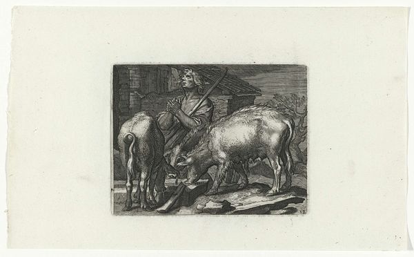 Editor: This etching, titled "Boer tussen twee koeien bij een ruif in een stal (kleine variant)", roughly translates to "Farmer between two cows at a feeding rack in a stable". It's attributed to Jan Vrolijk and believed to be created between 1860 and 1894. It's a very busy composition, almost claustrophobic. What do you see in this piece? Curator: I see a window into the rural experience, a lived reality often romanticized yet grounded in labor and a specific relationship with the land. Consider how the image is composed; the farmer is positioned *between* the cows, suggesting perhaps an intertwined identity, his existence dependent on theirs, and vice-versa. It’s a commentary on human-animal relationships, especially pertinent when considering the industrialization of farming in the 19th century. Do you think Vrolijk might be subtly commenting on the changing agricultural landscape? Editor: Possibly. It feels less like a celebration of idyllic farm life and more like just... daily life, presented without embellishment. The limited use of light and shadow gives it an unpolished quality, as if the artist aimed to depict the scene with raw authenticity. Curator: Exactly. This rawness allows us to think about whose stories were deemed worthy of artistic representation. Peasant life was gaining traction as subject matter during this time. Courbet, Millet, and others challenged the art world, shifting away from academic paintings depicting the aristocracy. By depicting ordinary people and scenes, how does this change the narrative, the very *act* of observing and recording? What power dynamics are at play? Editor: That's fascinating. So, the simple act of choosing this subject matter, a farmer and his cows, is making a statement in itself? Curator: Precisely! It challenges existing social hierarchies and gives visibility to the working class, and encourages empathy. But who is the artwork ultimately serving, who is the intended audience, and why does that matter? Editor: I hadn't considered the social implications so deeply. Now I see it as a depiction of not just cows and a farmer, but a statement about labor and identity in a changing world. Curator: Precisely! Art helps us interpret history and allows us to see ourselves, others, and the structures that affect society.