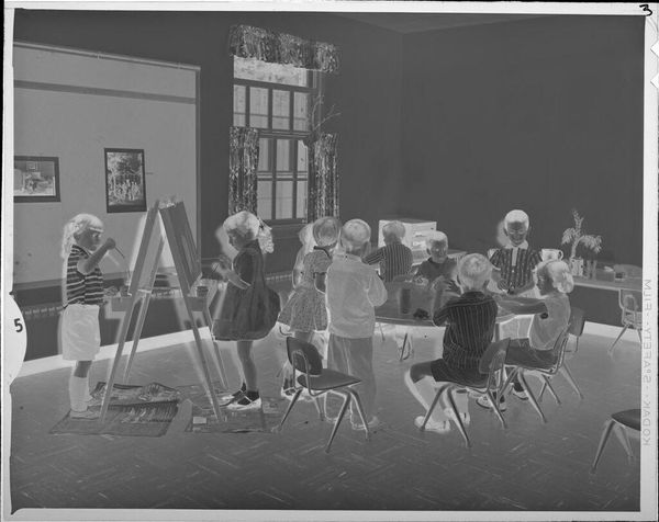 Curator: Here we have an intriguing photograph by Lucian and Mary Brown, simply titled "Untitled (small children in classroom)." Editor: My first impression is a sense of contained energy. Despite the muted tones, there’s a distinct circularity in the composition—the table, the arrangement of the children. Curator: Indeed, the classroom setting is rich with the iconography of early learning. The children, frozen in time, become symbols of innocence and potential. Look at the light filtering through the window, the curtains, the objects that create a familiar visual language, which resonates across cultural contexts. Editor: I notice the way the artists play with light and shadow, creating a flattened space that emphasizes the geometry of the room. The balance between the figures and their environment contributes to the photograph’s formal structure. Curator: And consider the children’s clothing and posture. Each detail, in its own way, evokes a sense of collective memory, calling upon our own associations with childhood and schooling. Editor: Yes, there's a complex interplay between the realistic and the symbolic, making it an intriguing piece. Curator: It's a compelling interplay between memory and representation, isn't it? Editor: Absolutely, a quiet but powerful visual experience.