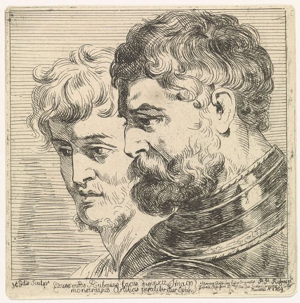 Damiano Pernati created this artwork, "Young man and an old man with piercing eyes," using etching techniques. The composition, limited by its monochrome palette, relies heavily on line and form to create depth and emotion. The two figures are rendered with intricate detail. The stark contrast between the youthful softness of one face and the aged, deeply lined features of the other is accentuated by the dramatic use of light and shadow. We can see that Pernati is not just depicting individuals but engaging with themes of time, mortality, and the gaze. The old man’s piercing eyes invite the viewer into a dialogue about looking and being looked at. It challenges the viewer to contemplate what these gazes signify within broader cultural narratives. The print is a site of ongoing interpretation and discourse. This formal quality functions not just aesthetically but also as part of a larger cultural and philosophical engagement.