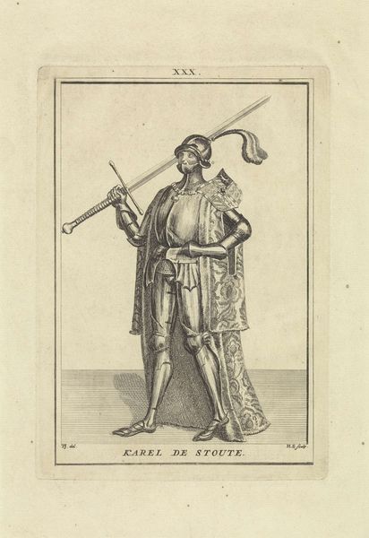 This print of a Gepiden warrior, made by an anonymous artist, captures a figure adorned in meticulously detailed armor. Look closely at the fine lines, achieved through the technique of engraving. Metal would have been the primary material of a Gepiden warrior's armor. Each plate would require skilled labor, from smelting to forging. The weight and texture of these materials surely impacted the warrior's movement and presence. The artist emphasizes this materiality through careful rendering of light and shadow, the cross-hatching suggesting the textures of chainmail and the dense, overlapping scales of his skirt. Consider the social implications. This armor, painstakingly crafted and undeniably valuable, signifies power, protection, and status. It speaks to a society where skilled artisans and access to resources were essential for survival and dominance. The production of such gear reflects not only technological prowess, but also the hierarchical structure of the Gepiden society. By recognizing the labor and materials behind this image, we gain a deeper appreciation for the artistry and the society it represents, blurring the lines between craft, design, and fine art.
