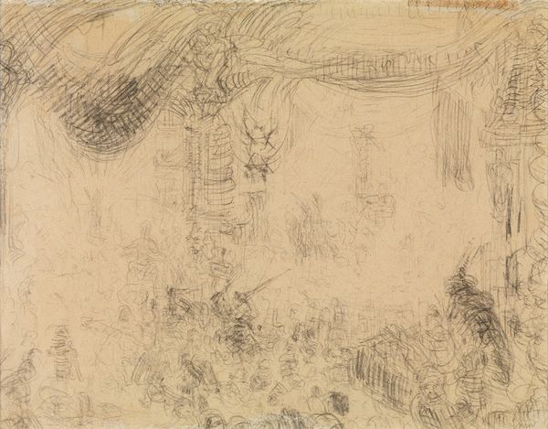 Curator: Ensor’s "The Cataclysms," created in 1888 using etching and ink, feels…apocalyptic. Editor: Chaos leaps out. I immediately register a dense layering of marks—everything's teeming and almost vibrating with frenetic energy. Curator: Absolutely. And looking closely, it seems to depict an annihilation scene. On the horizon line, a town is razed under a hail of divine beams erupting from anthropomorphic clouds. Below, thrashing waves threaten tiny ships carrying refugees. It feels rooted in late 19th-century anxieties. The spectre of revolution, class warfare, and rapidly transforming urban landscapes created widespread anxieties and anxieties related to faith in societal order. Editor: That reminds me of imagery in the Book of Revelation, particularly in its visualization of God unleashing plagues and punishments on earth. Even the sun and moon grow dark. Do you think Ensor was consciously alluding to this in his representation of this landscape's demise? Curator: It's plausible, though Ensor was keen on satire and poking fun at tradition and dogma. I find it useful to remember the context of burgeoning Belgian socialist and anarchist movements around that time, which, like many apocalyptic movements, were highly critical of prevailing societal injustices. Ensor's sardonic nature makes me hesitant to read the subject as exclusively religious. Editor: I see what you mean. But these images do carry potent cultural weight. Consider how even secular movements adopt apocalyptic framing when pushing for drastic political change, often deploying symbolic acts of destruction and rebirth. Curator: A fair point! Ensor was a unique symbolist who borrowed from everywhere to explore ideas around political revolt and social reform, I'm very pleased to observe this kind of symbolic depiction of political change within an intersectional narrative. Editor: And this is a stark reminder that even now, we continue to wrestle with these types of symbols – grappling with anxieties and hopes about civilization's fate. Curator: Precisely! It highlights art's capacity to speak to enduring concerns across different cultural moments. Editor: Agreed. This work invites consideration beyond art history and extends to our ongoing social and political dialogues.