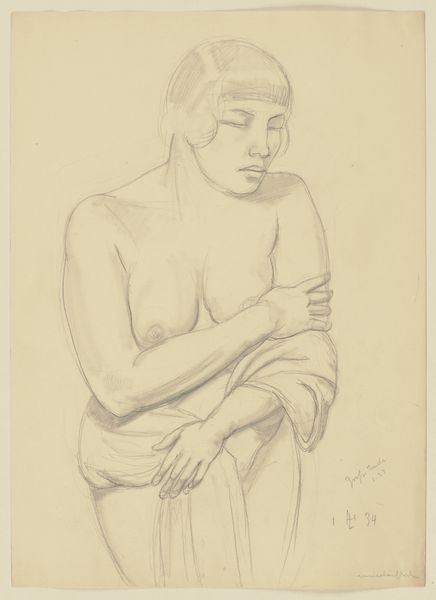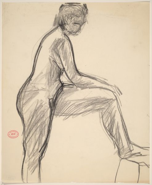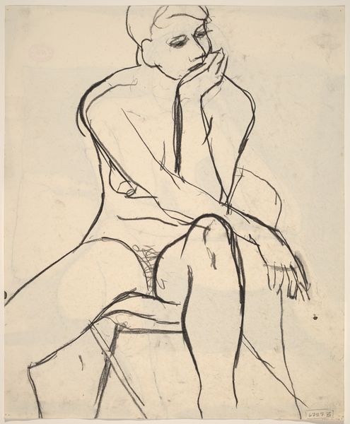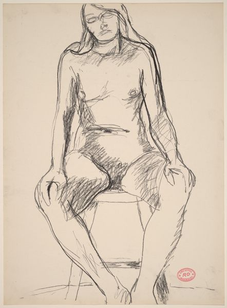 Curator: This is an untitled work by Richard Diebenkorn, likely created sometime between 1955 and 1967. It's a pencil drawing of a female nude seated on what appears to be a draped stool. Editor: It feels incredibly immediate, almost like a study. The lines are quite raw and energetic. I’m immediately drawn to the texture created by the varying pressure of the pencil. It gives the figure a sense of weight and form, doesn't it? Curator: Absolutely. Diebenkorn was working in a period where figuration was often contested by abstract expressionism, but he returned repeatedly to the figure. The rawness, as you called it, can be seen as part of his commitment to representing lived experiences rather than idealized forms. Consider the politics inherent in depicting the female form, especially in relation to debates about gender roles. Editor: And how the very act of sketching with pencil roots it in the tradition of academic figure studies - accessible and immediate. It focuses our attention on Diebenkorn’s technique and labor; it is what has materialized through this creative process. It is compelling to think about how readily available and cheap graphite is and how something so ubiquitous could be employed to depict an intimate moment of contemplation by the model. Curator: I think this speaks to Diebenkorn’s training but also how it's placed within evolving art world institutions, academies, and galleries, with debates circulating about art's purposes. The act of sketching, the preliminary study, also served a purpose when artworks became reproducible. Consider how the rise of print culture impacted art appreciation. Editor: I agree. We must remember to examine the conditions of artmaking! Think of all those other pencils Diebenkorn wore down leading up to this— all those erasures and failures that went into refining his skills. Each tool carries its own cultural context. Curator: Right, the implications for understanding art history. We need to understand how these artworks circulate, the value we attribute to them, and what institutions do to create this art historical record. This drawing gives insight into the artistic milieu from which Diebenkorn came. Editor: It’s incredible how so much information lies within a few graphite lines! Curator: It truly is, offering us a unique vantage point onto Diebenkorn’s evolving engagement with the human form and art history’s continuous unfolding.