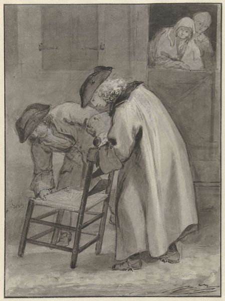 Editor: This is "Zittende man met zwaard," or "Seated Man with a Sword," by Dirck Hals, created sometime between 1601 and 1656. It's a charcoal drawing on paper, and it strikes me as surprisingly casual, given the subject's weapon and presumably, his status. What catches your eye in this piece? Curator: The apparent casualness, as you call it, is exactly what interests me. The medium of charcoal itself speaks to a certain accessibility, a departure from the more precious oils of the era. Consider the labor involved; charcoal production itself, the readily available paper. What social strata do you think this portrayal speaks to, moving away from the idealized portrayals we often see? Editor: That’s a great point. I hadn’t really thought about the accessibility of charcoal compared to oil paint. It almost makes it seem like Hals was deliberately trying to democratize portraiture. Would this make this a sort of genre painting and not a formal potrait? Curator: Precisely. Think about the sword – not just as a symbol of power, but a manufactured object. Where was it made? By whom? And for what purpose? The 'genre' element adds a layer; this is a moment captured, not just a posed representation. This invites consideration of the everyday lives that existed beyond royal portraits. How does that consideration change how we view 'genre' vs. portrait? Editor: I guess it blurs the line between them. It makes me wonder about the man’s actual job. It doesn't show any clues through labor; there is a glass in his hand though. The materiality here prompts me to ask more about the subject's own life, what he does outside that specific portrayal in the artwork, and the manufacturing elements associated to create that piece. I understand now! Thanks! Curator: Exactly. Seeing the artwork with emphasis on the materiality is essential, shifting our perception, and bridging the gap between the art and the socioeconomic reality surrounding its creation and existence.
