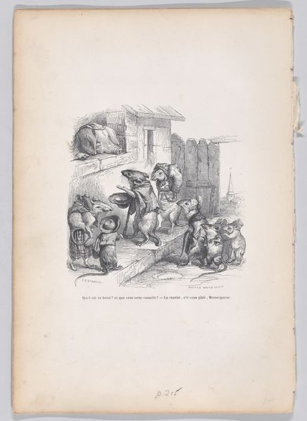 "He tells us: don't cry, Act!" is a lithograph created by J. J. Grandville, an artist known for his satirical illustrations that often featured anthropomorphic animals. Grandville was working in 19th-century France. His pieces offered commentary on the social and political issues of his time. He often used animals to represent human characteristics, behaviors, and societal structures. Here, a group of rodents is gathered around a cage where other rodents are being held captive, with the ever-watchful eyes of a cat peering from above. The print’s inscription, "He tells us: don't cry, Act!" suggests a call to action in the face of injustice or oppression. Grandville critiques human society by attributing human-like qualities to animals and highlights the absurdity and inequalities of human behavior. Consider, for example, the emotional weight of the scene, where the rodents are placed in a position of vulnerability and reflect human anxieties about power, control, and freedom. The print invites viewers to reflect on their own roles and responsibilities in addressing social and political issues, and in doing so emphasizes both the personal and collective dimensions of political action.