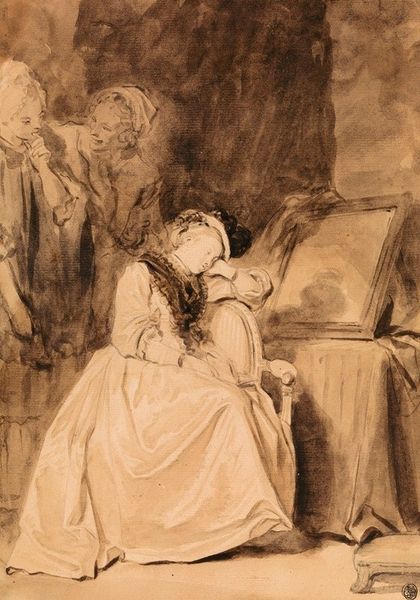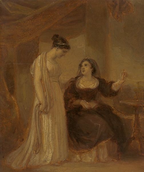 Curator: Looking at this piece, I’m immediately struck by the drama, the tension in the posture of the standing figure. There's an undeniable sense of dread permeating the scene. Editor: Indeed. This work, an oil on support measuring 241 by 203 mm, is currently untitled. Painted by Robert Smirke, an artist active from the late 18th to the mid-19th century, the piece captures a moment heavy with implied narrative. Curator: I see themes of female fragility, perhaps even a commentary on the limited roles afforded to women at the time. Is the woman swooning a representation of societal constraints? Editor: That's a valid perspective. Considering Smirke's historical context, his illustrations often catered to popular literary narratives, reinforcing certain social norms even as they entertained. The voyeuristic male figure adds another layer of complexity. Curator: Yes, the male figure peering from behind the curtain is especially disturbing. It seems the artist is challenging us to consider issues of power, vulnerability, and perhaps even consent. Editor: The staging certainly intensifies these readings. It encourages reflection on what it meant to be a woman in the 18th century, and the precarity of her position. Curator: Smirke's art, though often overlooked, invites conversation on issues that still resonate powerfully today. Editor: Precisely. There's a persistent echo of social dynamics embedded within this small piece, prompting ongoing discourse.