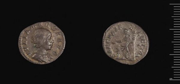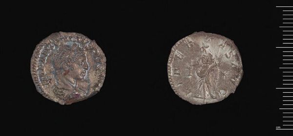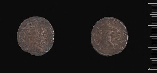 Editor: Here we have a Denarius of Septimius Severus, an artifact from the Harvard Art Museums. It's easy to overlook something so small, but the composition is surprisingly complex. What elements of its design stand out to you? Curator: Note the bilateral symmetry in the figure on the reverse. The composition emphasizes balance, almost a mirror image, despite the wear on the coin’s surface. This is an intentional design choice, a play with form to project imperial authority through visual harmony. Editor: That's fascinating! I hadn't considered how the symmetry contributes to the overall message. Curator: Indeed. The incised inscription, even in its fragmented state, encircles the central image, further reinforcing the coin’s symbolic function as a self-contained unit of power. Do you see how the texture of the metal itself plays a role? Editor: Now that you mention it, the wear and imperfections provide a certain depth, contrasting with the crisp lines of the original design. I see it differently now. Curator: Precisely. The interplay between form and decay creates a dialogue across time. Editor: Thank you! I've definitely gained a new appreciation for the artistry in something as humble as a coin.