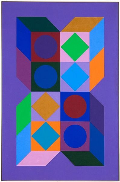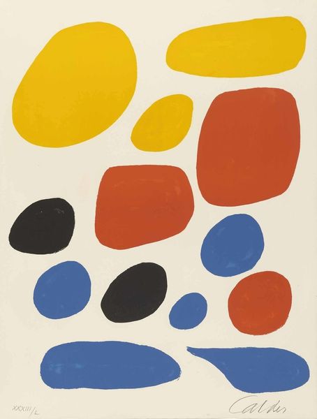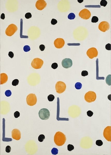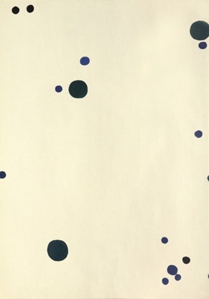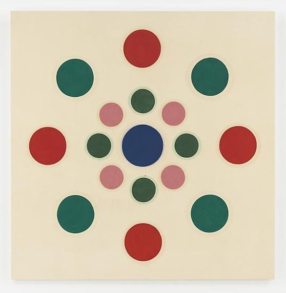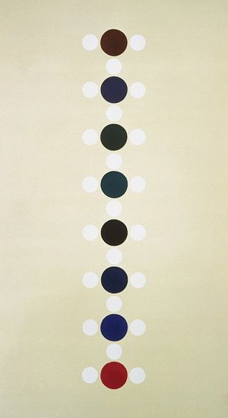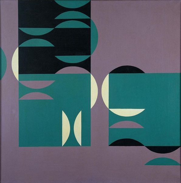 Editor: Here we have Thomas Downing’s *Green Square*, a painting using acrylic paint. What strikes me most is the balance between the vibrant green background and the simple arrangement of colored circles. It feels almost… serene, despite its boldness. What do you make of this work? Curator: The composition invites a formal reading. Note the spatial relationships between the circles and the square field, how they generate visual tension and release. The chromatic contrast establishes figure-ground relationships which, while minimal, structure the viewing experience. What structural relationships are most compelling? Editor: I think it's how the circles seem to defy gravity, almost floating downwards. It's unexpected, given their solid forms. The way they shift in tone, too. Curator: Indeed, that dynamism is critical. The subtle variations in the color—the shift from a lighter blue, to a deeper indigo, to pink—disrupt the static potential of pure geometric abstraction. This play suggests a semiotic register, almost a language within color. Editor: A language? Could you expand on that? Curator: Think about it—the color acts as a signifier, divorced from representational content, and directs us back to the inherent properties of the color itself, as well as our subconscious or culturally learned association of it. Editor: That’s a fascinating perspective. I was caught up in the surface appeal, but now I see how Downing manipulates color and form to engage with deeper theoretical ideas. Curator: Precisely. Downing gives us the elements of art in its simplest guise that speaks to something much more complex.