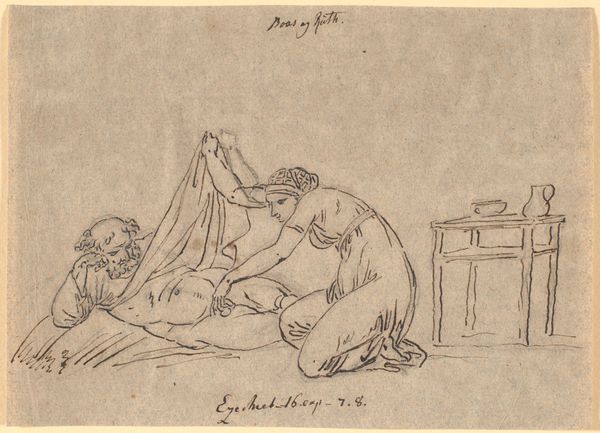 Nicolai Abildgaard rendered this drawing of a woman, infant, and monster, sometime between 1760 and 1800, using pen and brown ink on paper. The fluid lines of the pen reveal Abildgaard's skilled hand. The use of ink allowed for quick, expressive marks, capturing the drama of the scene. The transparency of the ink on paper creates depth and shadow with minimal effort. The social context of this artwork is intriguing. Was this a quick preliminary sketch for a larger painting, a personal exploration of fear, or something else? The artist probably made a decision to quickly record his vision, and the qualities inherent in pen and ink - speed, linearity, and tonal range - serve his purpose well. Recognizing the importance of the materials and processes used in its making can help us understand the artist's intent and the cultural significance of this evocative drawing, beyond the traditional boundaries of fine art.