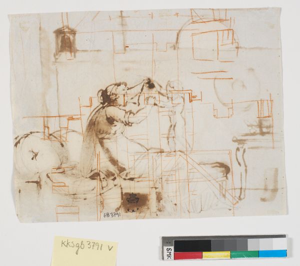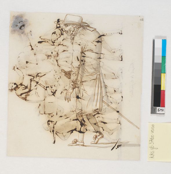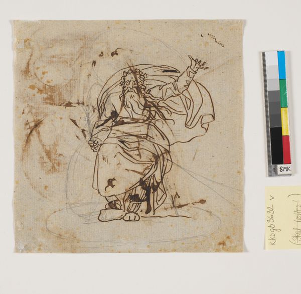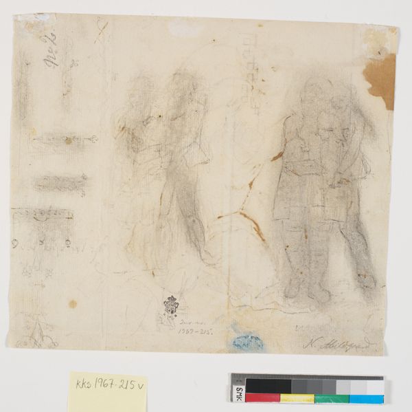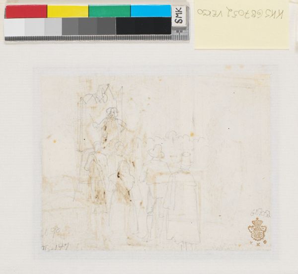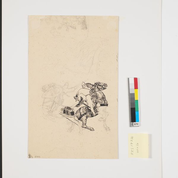 Editor: This is Niels Skovgaard's "Udkast til øverste del af illustration til Pontoppidan, Odysseus rejser og eventyr," a pencil and ink drawing from 1914. It’s a dynamic sketch, very linear, depicting figures that seem to be from ancient times, maybe Greece. What's your interpretation? Curator: This drawing, intended as an illustration for Pontoppidan’s retelling of the *Odyssey*, offers a fascinating glimpse into the role of classical imagery in early 20th-century Danish culture. Skovgaard uses a stark, almost academic line, reminiscent of historical painting. Considering the political climate of 1914, on the cusp of World War One, how might the *Odyssey* resonate with its audience? Editor: A story of a long and difficult journey, maybe about enduring hardship and finding your way home? Curator: Exactly! And about leadership. Odysseus wasn’t just about physical strength; he was also cunning and persuasive. Skovgaard's choice to depict him, and perhaps Athena, as these almost heroic figures, what does it tell us about how classical narratives were being used? Editor: To reinforce certain ideals or values, maybe? Like leadership and resilience? Curator: Precisely. Think about the institutions that might have supported this work: the publisher, the educational system, even the museum itself. What role did they play in promoting these interpretations of history? Editor: I hadn't considered it that way. It’s interesting to think about how illustrations like these shape our understanding of history, not just as historical records, but as active participants in a cultural conversation. Curator: Absolutely. And how those conversations change over time. What was valued then might be interpreted differently now.