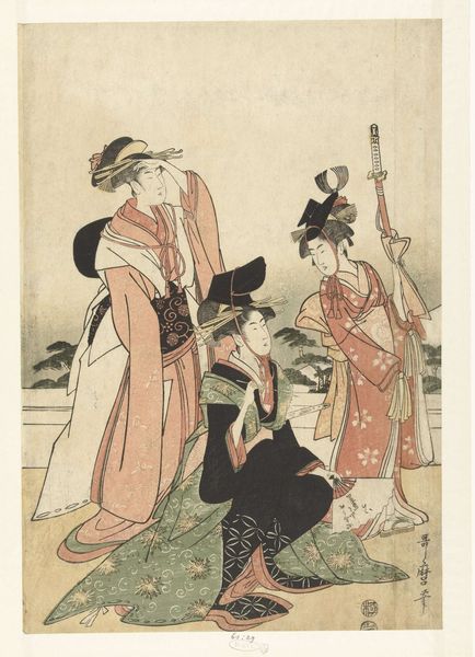 Editor: We are looking at "The Visit" by Hosoda Eishi, likely created between 1788 and 1792. It's a woodblock print, and the subdued palette gives it a serene, almost melancholic feel. There are four figures grouped asymmetrically on the page, three women on a path, near a wheeled structure that's truncated on the side. What catches your eye? Curator: My focus immediately gravitates to the carefully orchestrated composition. The artist’s deliberate use of the asymmetrically placed figures and the wheeled structure, the soft, desaturated colour palette and the lines of sight all establish a visual harmony. The overlapping planes—figures against landscape against architectural forms—demonstrate the sophistication inherent in the Ukiyo-e tradition. The medium itself, woodblock print, is an important element here. Consider the way the artist coaxes texture and tonal variation from a traditionally rigid medium, it presents a challenge, does it not? Editor: It does. I suppose it creates structure with colour? The way the different kimono and robes interact; there’s some kind of pattern language here? Curator: Precisely. Note how each kimono exhibits a unique pattern and texture, creating a visual symphony of lines and shapes. The stark black of one garment contrasts dramatically with the softer, flowing lines of the others. Each fold and drape meticulously rendered contributing to the artwork’s overall balance and rhythm. How do you see that structure being broken and maintained throughout? Editor: You’re right; it is deliberate! The lines of the women all point in similar directions with subtle variation. The large umbrella extends that shape and contrasts that symmetry, whilst continuing the same gentle curve as the wheeled cart’s edge, to maintain that structure. It’s quite brilliant when you look at the picture that way! Curator: Exactly. Eishi employs an impressive command over these formal elements and in doing so he transcends mere representation. Editor: This formal analysis has shown me how to really appreciate the artist's skill in harmonizing colour, texture and form into a visually rich design. Curator: Agreed, now we have looked deeper, the structural devices embedded within become clearer and the initial overall serenity, starts to really resonate.
