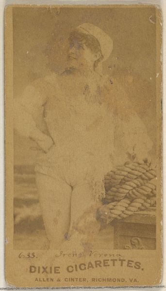Editor: We’re looking at "Card Number 62, Ida Vernon," a piece from the 1880s, part of the "Actors and Actresses" series by W. Duke, Sons & Co., who made Duke Cigarettes. It looks like a print of a photograph or drawing, maybe? It's sepia-toned and pretty faded. I find the subject’s distant gaze kind of melancholy. What do you see in this piece? Curator: Oh, melancholy is a brilliant word for it. To me, these cards are like little windows into a fleeting past, whispers of forgotten fame. It's more than just a portrait; it's a piece of marketing, an artifact of a time when actors were these glamorous, almost mythical figures. It's sepia now, but it once was vibrant, distributed everywhere, a reminder of what it meant to participate in daily popular culture. It's interesting how commercial objects acquire, through use and entropy, an accidental beauty that moves me, like faded pressed flowers tucked between the pages of a much-loved novel. What does her expression suggest to you, aside from melancholy? Editor: Hmm, perhaps a sort of weary resignation? Like she knows she's being commodified. Is it strange to feel that for a portrait on a cigarette card? Curator: Not at all! That tension – between art, celebrity, and commerce – is precisely where the interest lies, isn’t it? The ephemerality of fame, captured in a disposable object meant to be consumed and discarded. We gaze into her eyes, searching for…what, exactly? A connection? A secret? Editor: I never thought about it that way. The cigarette card elevates something very temporary and almost throws it away. Curator: Precisely. The whole thing makes me strangely nostalgic and a little sad, which may say more about me than about Ida Vernon! Thank you for the fascinating insight. Editor: Thanks, it’s great to delve into this history through a small but telling item.
