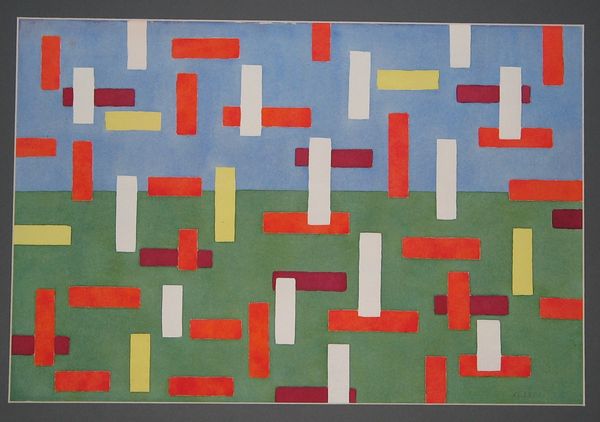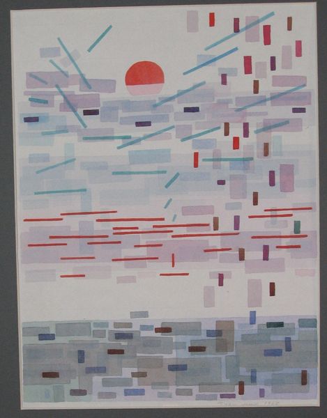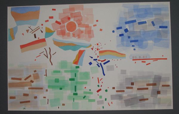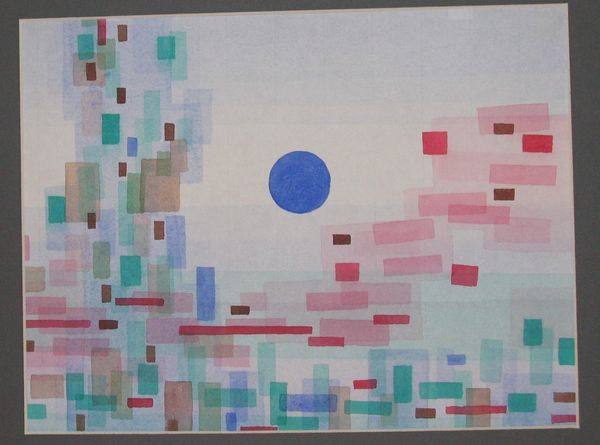 Editor: Here we have Hryhorii Havrylenko's "Composition" from 1967, a watercolor painting featuring a range of geometric forms in various hues. I'm struck by the way these shapes overlap, creating a sense of depth and movement. What can you tell me about this work? Curator: The first thing that catches my eye is the deliberate layering of the watercolors, creating a transparency that belies the inherent materiality of the pigments themselves. We're meant to consider the means by which this image came into being. Think about the social context: in 1967, abstraction had become very popular, seemingly divorced from its own social conditions, but the materials themselves - watercolour - implies process, and links itself more closely to labour. Editor: That's fascinating! So, are you suggesting that his choice of watercolour over, say, oil paint, carries some deeper meaning relating to artistic process or even something about its context of production? Curator: Precisely. The fluid nature of watercolor resists the kind of clean, machine-like precision one might expect in a modernist composition. By using watercolor and overlapping colours to produce new forms through layering, we also need to ask ourselves - where did these colours and forms originate, and whose labour facilitated their application? Editor: I see. It shifts the focus from just admiring the end result to considering the artist's choices and even how the art industry may function, perhaps not as neutral a thing as we assumed! Curator: Exactly. Havrylenko's "Composition," like so many seemingly “purely aesthetic” works, reminds us that art is fundamentally a product of materials, labor, and social forces, not merely aesthetic contemplation, that must never escape consideration. Editor: Well, I definitely see it differently now. Thanks for that insight. I have to look for those implications in future works, and consider production.