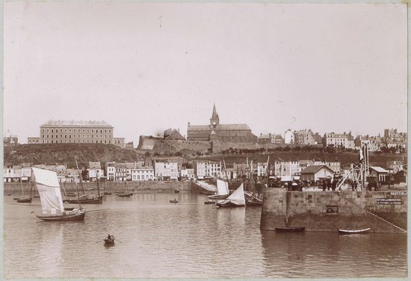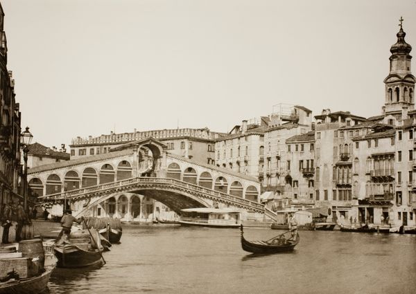 Curator: This gelatin silver print, taken by Carlo Naya, captures the Hotel Royal Danieli in the Palazzo Dandolo along with boats on the Riva degli Schiavoni, in Venice, circa 1870-1890. What strikes you initially? Editor: A dreamlike atmosphere. The monochromatic tones create an ethereal, almost melancholic mood. Venice always had that sort of emotional intensity of past grandeur. Curator: Naya's photography certainly partakes in a Romantic vision of Venice. Note how the Palazzo, now the Hotel Danieli, dominates the frame. It projects power but is softened by the water. The choice of capturing this hotel could have a significant role in the representation of the power of Venice. Editor: Exactly, the hotel itself, repurposed from a palazzo, speaks to the layered history, both the grandeur and decay that are at the heart of Venice’s visual appeal. The boats also crowd around its base and this relates to Venice's strong maritime power that it used to have. Look closely, the way he has captured this it truly is almost timeless! Curator: This era saw Venice transform into a key destination for aristocratic tourists, and this photograph served the demand for picturesque mementos. We observe the merging of Venice’s identity as an ancient Republic with its modern function within an Italian nation-state. Editor: The boats, I think, become a symbol of the continuity amidst change. Even if the city reinvents its roles in new political and cultural realities, certain aspects of it maintain a deeper sense of self. They represent a tangible connection to that powerful past. Curator: A poignant reflection on how art interprets the narrative and symbolism woven within the visual and political history of Venice. Editor: Indeed. Carlo Naya really manages to make this historic symbol, communicate through something as simple as a tourist picture.