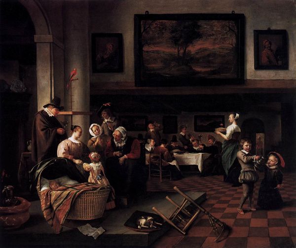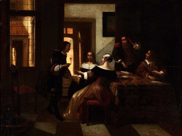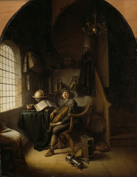Curator: Gerrit Dou, master of the Dutch Golden Age, invites us into the intimate world of "Burgomaster Hasselaar and His Wife," now residing at the Brooklyn Museum. A compelling exploration of status and marital dynamics. Editor: It feels incredibly staged, doesn’t it? Almost like a theatrical production. The couple is posed, stiff, with an elaborate backdrop designed to impress. A beautiful backdrop, nonetheless. Curator: It's important to recognize that Dutch portraits served specific functions; they showcased affluence but also the evolving social identities within the Republic's burgeoning mercantile class. Hasselaar’s position in society shaped this representation profoundly. Editor: Yes, there is more than meets the eye. He sits with that enormous hat, beside the celestial and terrestrial globes; it shouts wealth, doesn’t it? Still, look at his gaze. It’s a little sad, isn’t it? Even lost. Like he’s wearing his finery but doesn’t quite belong in it. Curator: Absolutely, and the staging here goes further. A book opened prominently may indicate the value of scholarly life, but also remember Dutch genre painting elevated everyday life to high art, yet not without underlying codes of morality and social conduct. Editor: Maybe it's just me, but she seems unhappy as well, gazing outward, as if contemplating all this 'stuff', trapped between those wooden walls. All their worldliness, collected here for eternity in pigment, looks heavy! I find it almost absurd, you know? Curator: The painting underscores how social and gender expectations confined individuals in a society undergoing profound shifts. We can analyze details to excavate meaning related to women's roles and the evolving definition of civic virtue. Editor: It’s as though they’re prisoners in a meticulously crafted diorama. Even their dark clothing and that large globe, almost become part of the environment, rather than standing out. Is this the burden of success, perhaps? Or just my projecting a lot on to this? Curator: Not at all. Your observation points toward deeper commentary; where aspiration, representation, and lived experience interweave, urging viewers to unpack power, gender, and status within domestic space. Editor: This has me thinking how images and material can reveal the humanity inside us; not just about societal positioning, but how the internal lives reflect or push back. Thank you for bringing clarity through such rigorous awareness. Curator: Thank you! The dialogues this artwork incites offer unique access to histories and alternative outlooks on portraiture and power structures.