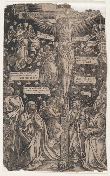 Editor: So, this is Albrecht Dürer's "Keizer Maximiliaan I knielt voor Christus," created in 1519. It's a mixed-media drawing, almost like an elaborate print. It feels very formal, almost stiff in its presentation, and I'm struck by the level of detail. What stands out to you in this piece? Curator: I am drawn to the layering of symbols. Notice how the artist depicts Maximillian kneeling. This act is a powerful statement of humility and faith, carefully placed within the composition. Editor: Yes, he's literally at the feet of Christ, as if presenting himself. Curator: Exactly. And consider the company he keeps – various saints, each an icon representing particular virtues or affiliations. Who might they symbolize for Maximilian? Do you recognize any of the individuals, based on the symbolic props they wield? Editor: I see Saint George with his spear, maybe representing military strength and virtue. Saint Barbara? What does she represent? Curator: Saint Barbara often embodies protection, especially against explosions. Her inclusion hints at anxieties around power and safety during that period. See how this collection of figures emphasizes Maximilian's virtues while subtly addressing his concerns as ruler. Do you think this engraving immortalizes the emperor as a historical figure and a pious individual? Editor: It definitely casts him in a favorable light. Knowing the context, it seems like it's not just a portrait, but also a calculated piece of propaganda. I learned so much today. Thank you. Curator: And I am reminded how potent images remain across the ages in preserving the echoes of culture.