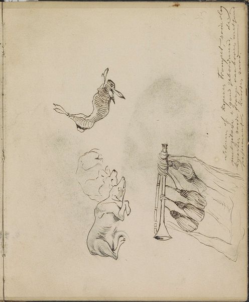This is a pencil drawing called 'Ducks, Cattle and Chickens on a Stick' by Johannes Tavenraat, created sometime in the 19th century. During Tavenraat's time, the Netherlands was experiencing a period of agricultural innovation and growth. Drawings and sketches like this served as studies, capturing the essence of rural life and the animals that were so integral to the Dutch economy and identity. The placement of the animals seems almost whimsical, and not necessarily how one encounters them in real life. The cattle look like ghosts in comparison to the fowl. This arrangement encourages us to think about how the animals were perceived and valued in Dutch society. Were they merely economic commodities, or did they hold a deeper cultural significance? How does Tavenraat subtly convey this through his art? It is this quiet attention to detail and the subtle commentary on the world around him that makes Tavenraat's work so compelling.