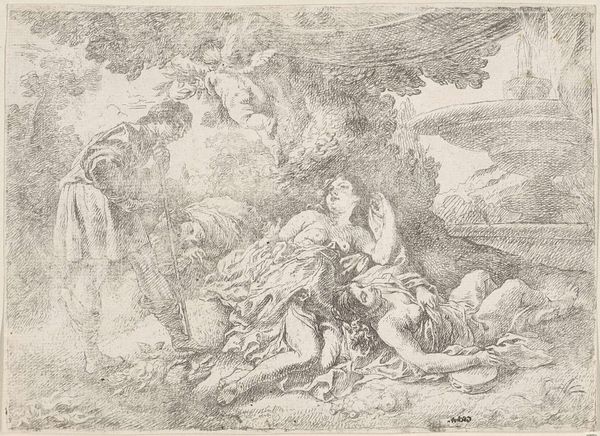 Editor: This is Salvator Rosa's "Combat of Tritons," an etching teeming with wild energy. The scene is a chaotic brawl; what do you make of all this swirling fury? Curator: It's a fantastic display of Rosa’s dramatic flair, wouldn't you agree? Think of the Baroque love for drama, amped up! These aren't your peaceful, decorative sea creatures; these are raw, untamed forces of nature locked in a primal struggle. One can almost hear the roaring sea! Editor: Yes, I see it now. It's not just a fight, it's a force of nature unleashed. Thanks! Curator: My pleasure. Rosa invites us to dive headfirst into the tempestuous depths of the imagination. Don't be afraid to get wet!