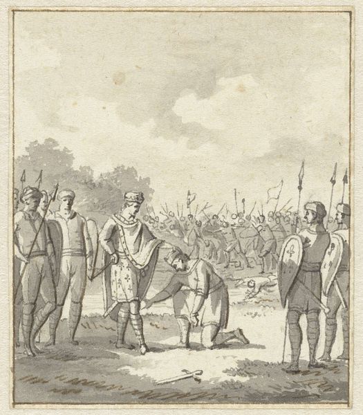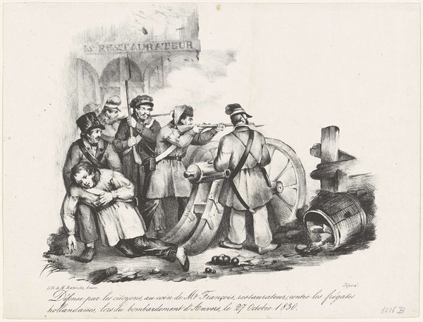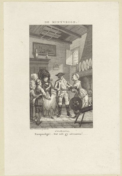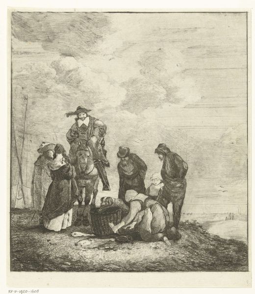 Curator: This etching, made by Jan Baptist Tetar van Elven, offers us a glimpse of "Vissers op het strand van Scheveningen"—"Fishermen on the beach of Scheveningen." It was created sometime between 1815 and 1889, and you can almost smell the sea air, can’t you? Editor: It’s quite monochromatic, isn’t it? Instantly giving it a nostalgic air. I see a cluster of figures dominating the foreground, but their expressions are curiously neutral, or perhaps even somber, despite the coastal setting. What's your read on their relationship to the sea, beyond the obvious profession? Curator: I think there's a palpable stoicism there, wouldn’t you agree? Van Elven manages to capture that sense of resilience, the daily negotiation with nature. Look at the way he renders the textures—the rough ropes, the worn fabric, the almost glassy sheen of the sea. The contrast adds so much, the almost stoic resolve of everyday life. Editor: Precisely! The interplay between land and sea isn’t just pictorial, it's a representation of labor and the gendered divisions inherent to it. The women and children seem positioned in support roles, while the men, presumably, are directly engaged with the more visible act of fishing. The Romantic ideal of nature here bumps against the realities of a patriarchal society structured by work. Curator: That's a fascinating point. I think he’s romanticizing that reality. He almost imbues the scene with a sort of quiet heroism. I imagine these characters have many compelling and dramatic untold stories. The sea has that effect. It suggests epic possibilities. Editor: Perhaps the unstated narrative is in the details. Consider their clothing; are these markers of a specific cultural identity? And how does the inclusion of these figures shape the overall interpretation of landscape as both a resource and a cultural space? Whose stories are considered “historical”, and whose are marginalized? It all ties to access and power. Curator: Van Elven gives us an invitation, a doorway to their world that is not about answers, necessarily, but instead focuses on deeper connections and meanings that might linger below the surface. The longer you gaze into it, the richer it becomes, a dance of labor and legacy upon the strand of time itself. Editor: Indeed. Gazing into this piece, one begins to meditate on the daily grind of survival, of enduring across the waves of time, whose perspective of whose experience and place. I wonder about the waves of future stories to tell beyond a monochromatic print of its time.