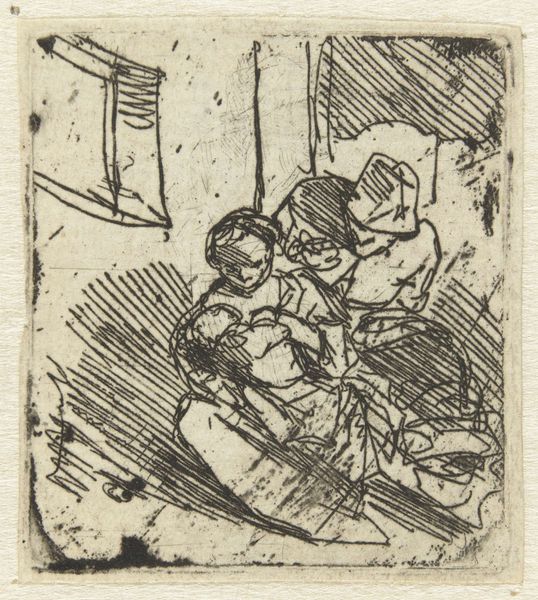Editor: Here we have "The Family" by Cornelis Bega. It's a tiny etching, no bigger than a postage stamp! The linework gives it a sense of gentle intimacy. What draws your eye when you look at this piece? Curator: It feels like a stolen moment, doesn’t it? A glimpse into the everyday. Bega, even with such minimal lines, captures the warmth of human connection. There’s a real tenderness in how he renders the figures huddled together. What do you make of the background, or lack thereof? Editor: It almost feels like they're in their own little world, separate from everything else. Curator: Precisely! That's the beauty of Bega's vision. It's not about grand pronouncements, it's about the quiet poetry of family life. Editor: I see it now, the closeness tucked away in the simplicity. Thanks!