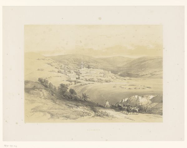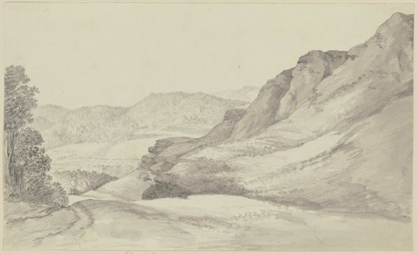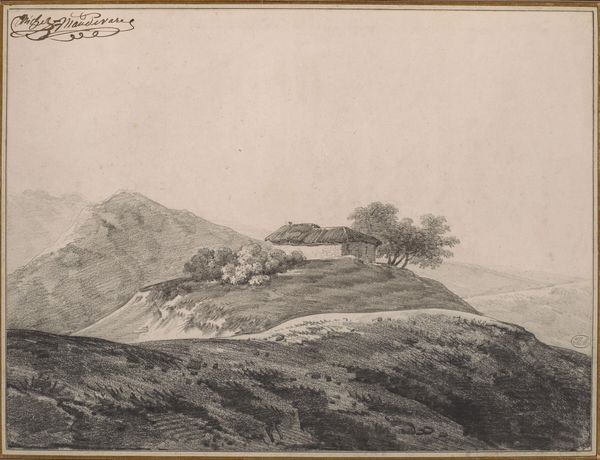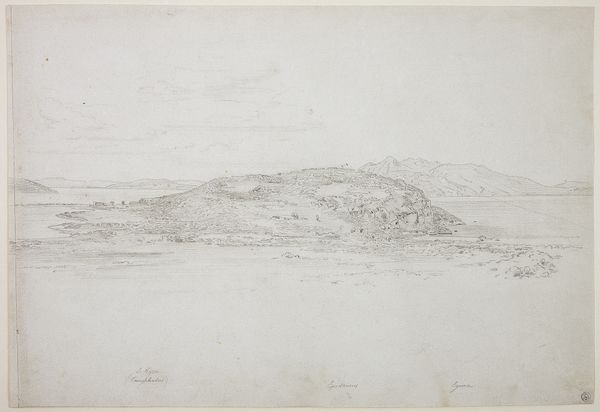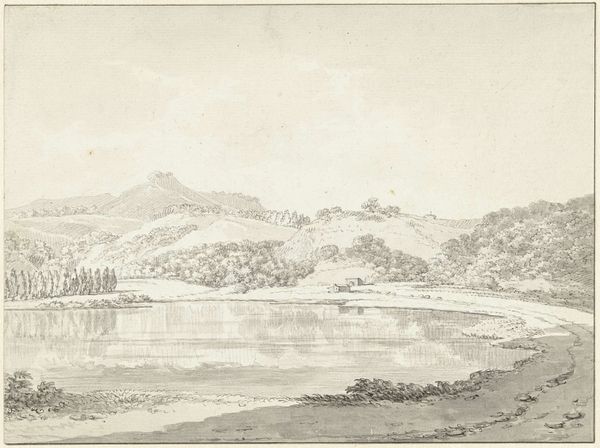 Curator: Hendrik Voogd created this landscape drawing titled "Het meer van Verni, het dorp Genzano en het dorp Verni," dating it somewhere between 1788 and 1839. It depicts a serene Italian vista using pencil on paper. Editor: It’s quite subtle. The monochromatic rendering makes the whole scene feel almost ghostlike, a memory clinging to the page. I sense both stillness and a sort of melancholic quiet here. Curator: Voogd, known for his contributions to Dutch Romanticism, was deeply influenced by Italian landscapes. Consider the placement of Verni and Genzano around the lake, a positioning perhaps chosen to illustrate humanity’s relationship with nature and settlement patterns during this period. The very act of sketching en plein air was a cultural and artistic shift at that time. Editor: And there's an interesting element of romanticising rural labor, or perhaps omitting it entirely. I notice an absence, a glossing over of the economic and social realities faced by rural communities. Who lived there? What was life actually like for them? The drawing almost feels escapist in its gentle portrayal. Curator: That's a fair critique. Looking at his technique, the gentle shading suggests a softening of any harsh edges or realities, allowing for an idealized interpretation of the land and its connection to cultural memory. The lake itself reflects calmness, almost like an ethereal looking-glass reflecting societal and individual nostalgia. Editor: I see the lake more as a lens through which to reflect upon present inequalities rather than romanticize a rosy-tinted past. Whose stories have been intentionally left out? Who controls these landscapes now? And how have social structures shaped this environment? Curator: I concede, interpreting such imagery critically demands this sort of lens, helping uncover hidden meanings behind conventional aesthetics and artistic trends. Editor: Absolutely. Examining landscapes requires questioning our role within them. What appears peaceful on the surface can sometimes mask deeper inequalities, even today. Curator: Indeed. Understanding context can greatly shape how we interpret such subtle, symbolic cues. It enriches our appreciation, reminding us of complex meanings interwoven with artistry. Editor: Well said. Considering multiple perspectives is vital; looking beyond what seems superficially calming and acknowledging the multi-layered narrative opens it to modern analysis and dialogues.