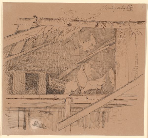 Editor: Here we have Sidney L. Smith's "Barrett's Grist Mill," an etching, which presents an interior view with complex structural beams. I'm struck by the contrast between the detailed textures above and the relative abstraction below. What do you see in this piece, focusing on its formal elements? Curator: The composition relies on a fascinating interplay of light and shadow achieved through the etching technique. Notice how the artist uses line variation to create depth and texture, particularly in the depiction of the wooden beams and what appears to be some sort of organic overgrowth. This creates a dynamic surface, despite the static subject matter. Editor: It’s interesting how the strong diagonal lines draw your eye upwards. Curator: Indeed. This deliberate use of perspective and line directs our gaze, structuring our perception of the space. What effect does this formal arrangement have on you? Editor: I think the focus on texture and the stark contrast makes it feel very immediate and raw. Thank you. Curator: I concur. By analyzing its intrinsic formal qualities, we gain a new appreciation for the artist's vision.