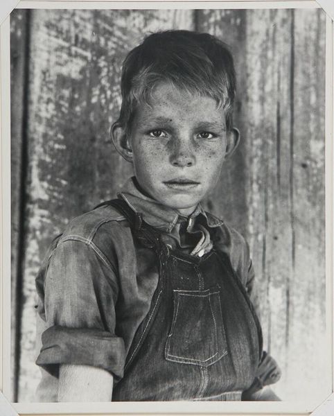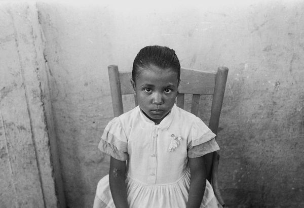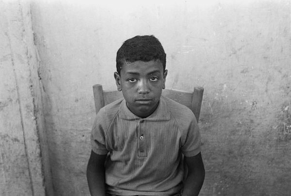 Editor: This is Akram Zaatari's "Anonymous. UNRWA school, South Lebanon, 1960s. Hashem el Madani," a photograph. The starkness of the black and white image and the direct gaze of the boy are quite arresting. What do you see in this piece? Curator: The geometric simplicity is striking. The near-perfect symmetry of the composition, bisected by the central figure, lends it a formal air. Note how the textures—the rough wall, the patterned shirt, the smooth face—interact. Editor: The textures do create a very nice contrast. What about the boy's expression? Curator: His expression serves as a focal point, drawing the eye in. Observe the tonal range of the photograph, moving from the stark white of the wall to the deep shadows. It is this interplay of light and shadow that creates depth and presence. Editor: I see that now. Thanks for helping me look closer! Curator: Indeed, the photograph, through its formal elements, invites us to contemplate the nuances of representation and the power of the gaze.